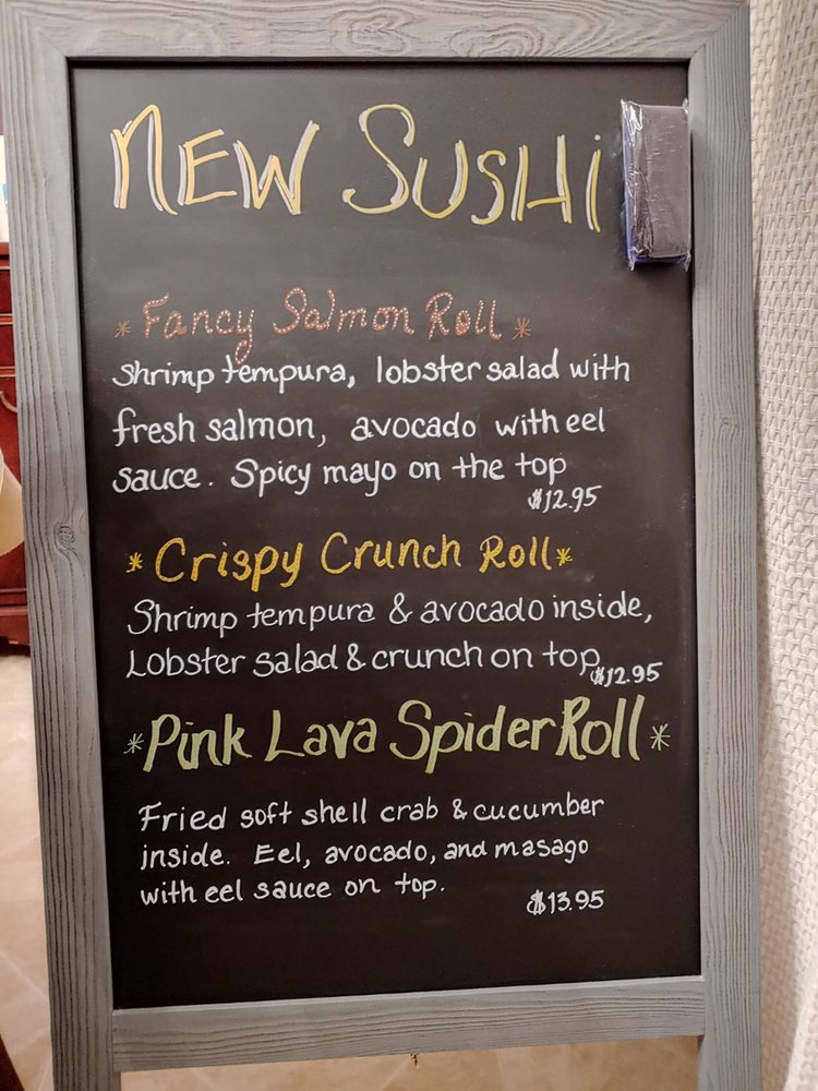 Shrimp tempura, lobster salad with fresh salmon, avocado with eel sauce and spicy moyo on the top.